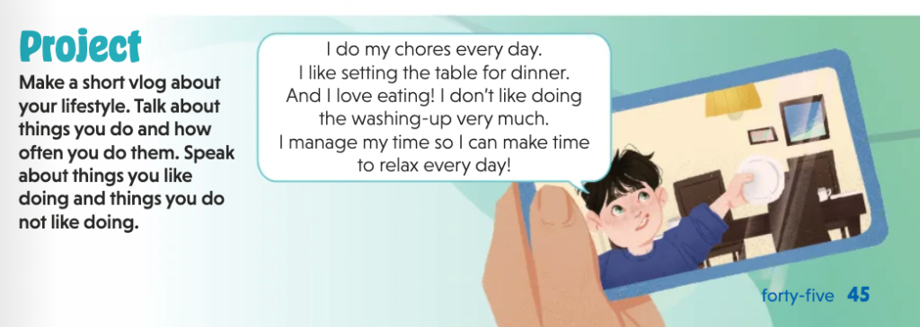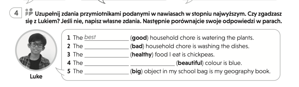 <- To zadanie z podręcznika do klasy piątej. Przy okazji ćwiczenia stopniowania przymiotników pojawiły się słowa znane już uczniom z poprzednich rozdziałów: obowiązki domowe (watering the plants, washing the dishes), nazwy produktów spożywczych (chickpeas), czy przedmiotów szkolnych (geography). Dzięki temu mogą utrwalać wcześniej poznane słownictwo, jednocześnie ćwicząc nowe zagadnienie gramatyczne.